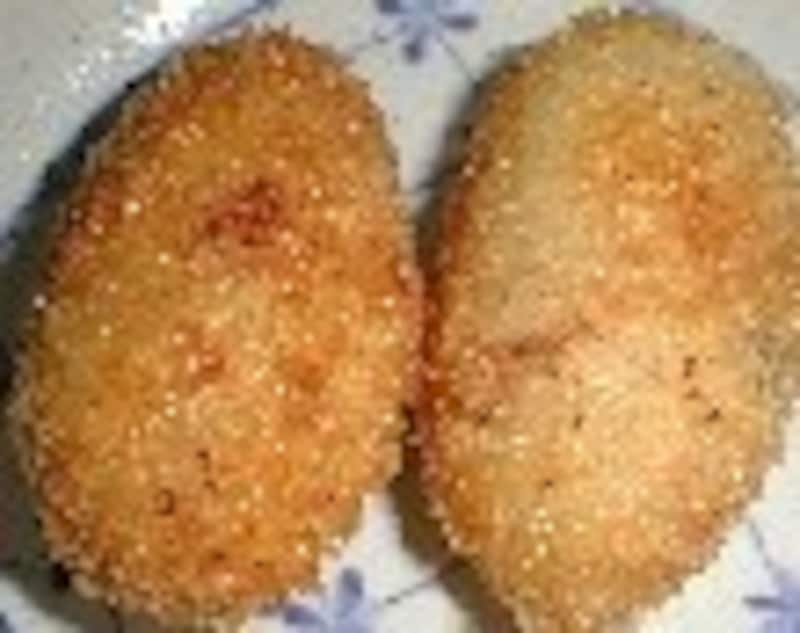 | 材料(8~10コ分) ・合びき肉100g・玉ねぎ半分・春雨少し・人参少々・椎茸2枚・ピーマン1コ・ゆで卵1コ・ケチャップ・小麦粉・生姜汁・砂糖・醤油・塩コショウ 作り方 具を作る▼ 1.春雨を硬めにもどし1cmに切る。 2.野菜をみじん切り。 3.挽肉、野菜、春雨の順に炒め、 小麦粉大さじ1をふり入れ炒め、生姜汁、塩コショウ、醤油、砂糖、トマトケチャップで味付け、 フォークでつぶしたゆで卵を加え、バットにあけ冷ましておく。 マッシュポテト▼ 1.じゃが芋6コの皮を剥いて、厚さを半分に切り、水から茹でる。2.柔らかくなったら湯を捨て、火にかけ水分を蒸発させ、鍋をゆすり粉吹き芋にし、潰す。 3.塩コショウして丸め、中に具を包み込み、小麦粉、卵液、パン粉をつける。 4.約180℃のたっぷりの油でカラリと揚げる。(コロッケが油から顔を出してると皮が破れる) ●付け合せは山ウドのマリネ ![]() バターライスに具とチーズとウインナーを入れ、衣をつけて揚げたライスコロッケ 【関連ページ】 【山菜のマリネ】