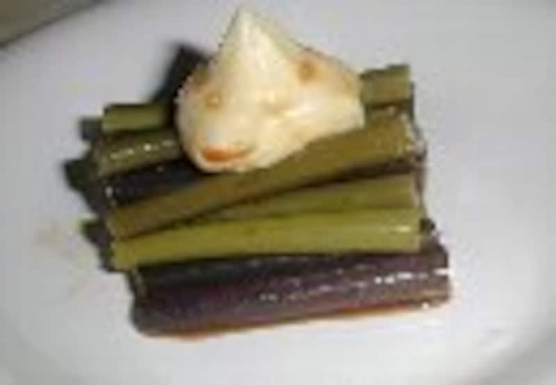 材料 アク抜きしたワラビ、味噌、山椒の葉 ●注:蕨叩き用の蕨は、アク抜きをする時点で、柔らかめにゆでます。 蕨のアク抜き(蕨叩き用) 蕨を鍋に並べる→重曹をふりかける→熱湯をかける→火にかけて茹でる→そのまま冷ます→水に浸し、水を2~3回取り替えながら一晩置く 作り方 1.アク抜き蕨が硬かった場合は、沸騰した湯にワラビを入れて柔らかく茹でて水を切る。2.まな板の上にとり、包丁でたたく。 3.味噌を加え、更にたたく。 4.すり鉢で山椒の葉をする。5.(4.)に叩いたワラビを加えて擂り混ぜ、酒をほんの少し入れ、味がたりなかったら味噌を足す。 あく抜きする際の、茹での工程で、一煮立ちで止め、以下同様に水にさらして一晩置けば、蕨の刺身(お浸し)になります。一般的には生姜醤油で食べますが、 マヨネーズとしょう油をかけてもおいしいです。【関連ページ】