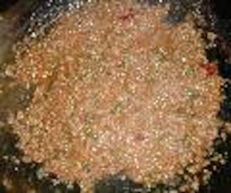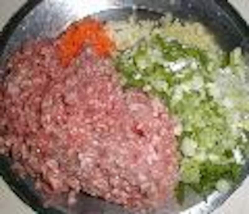 2.ひき肉、長ネギ、人参を加えて炒め、ポロポロになったら味噌を入れ炒め、スープ、砂糖、酒、醤油、ケチャップを加える。