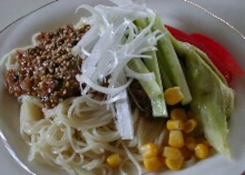 5.麺を茹でて、水でもみ洗いして、器に盛り肉味噌をかけ、野菜を飾る。お好みで白ゴマをふる。