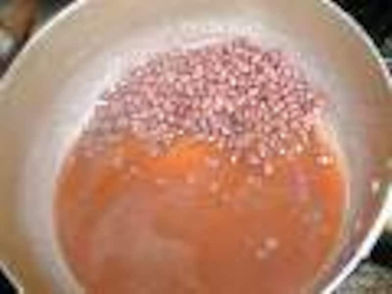 3.炊飯ジャーに餅米をあけて、小豆のゆで汁を加え、おこわ用の目盛りがあるジャーの場合は目盛り通りに、 ない場合は幾分少なめに水を入れ、大さじ2杯の水を取り除き、その分の酒を加える。