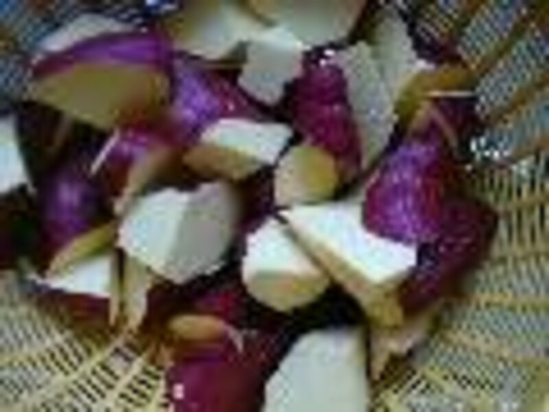 1.さつま芋を乱切りにし、水にさらしてザルにあけて、布巾で水分をふきとる。