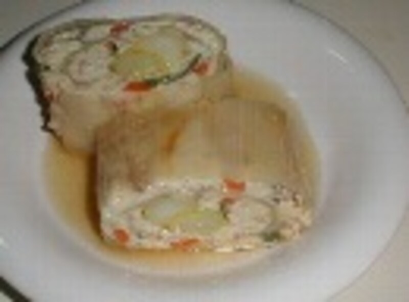 下仁田ねぎの太さを利用した逸品。ネギに、混ぜ物をした豆腐を巻き込み、煮物にしました。 崩れやすいので、一度電子レンジで加熱したほうが上手くいきます。 2. ネギ巻きけんちん ■材料4人分 ・下仁田ネギ2本.......葉を外す ・鶏挽肉.......40g ・豆腐150g.......軽く水切りする ・人参、椎茸.......千切り ・ねぎの青い部分少々......粗みじん切り ・おろし生姜......少々 ・卵......1/2コ ・片栗粉、醤油、塩.....それぞれ少量ずつ 煮汁 ・出し汁.....2カップ ・みりん.....50cc ・醤油.....大さじ3 ・塩......小さじ1/3 ■作り方 1.豆腐に野菜と調味料を加えて手でよく混ぜる 2.ネギは、縦に包丁を入れてほぐす。 3.ネギの内側に片栗粉をうすくふりかけ、具を巻きこみ、形を整える。 4.ラップで包み、1本につき2分ほど電子レンジにかける。 5.出し汁に調味料を加え、煮立ったらネギ巻きを入れ、コトコト7分ほど煮て火を止めて味を含ます。 6.そっと引き上げて切り分ける。 お好みにより辛子や生姜を添える。 切れる包丁で切り分けてください。 ●次のページは塩魚のネギ蒸し 前のページへ1234次のページへ