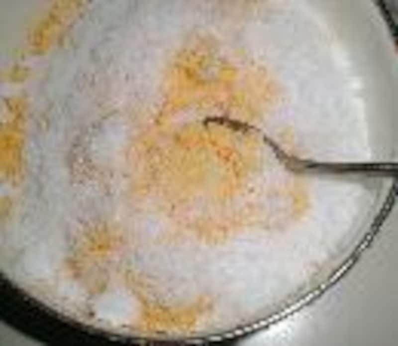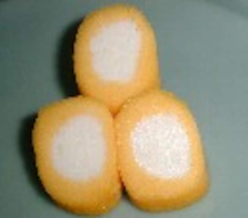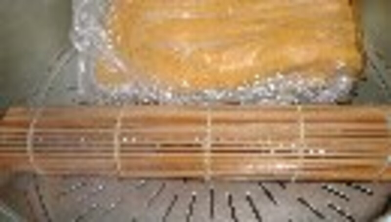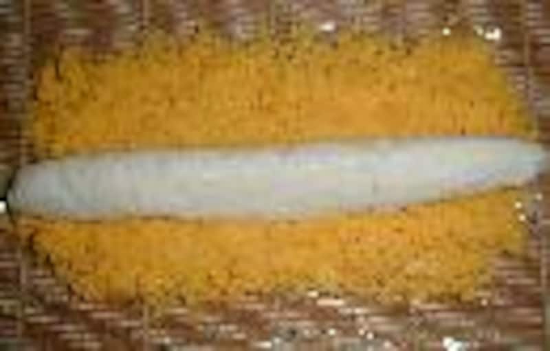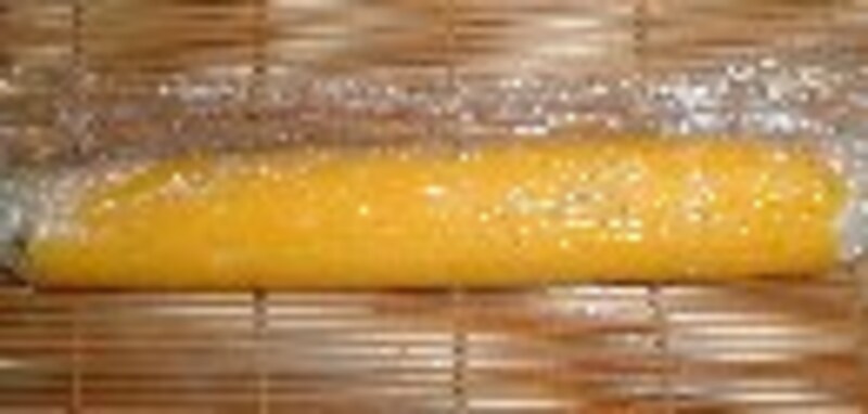 ゆで卵を白身と黄身に分けて裏ごしし、味をつけて蒸しあげて作る錦玉子。 裏ごしは白身のほうからしてください。 2.とり満月 【No1へ!】・ 【No2へ!】・ 【No3へ!】 ・【No4へ!】 ・【No5へ!】・ 【No6へ!】・ 【No7へ!】・ 【No8へ!】・ 【No9へ!】・ 【No10へ!】 1. 黄色と白の二色卵 ■材料2~3本分 ・卵6コ.......固ゆで卵にする(沸騰後10分間茹でる) ・砂糖.......大さじ6 ・塩......少々 ■作り方 1.ゆで卵を白身と黄身にわけて、それぞれ裏ごしする。 2.白身を布巾に包んで軽く水を絞る。 3.砂糖を、白身:黄身=4:6の割合で加えて混ぜる。塩は反対に白身の方に多めに入れる。 4.ラップの真ん中に白身を適量置き、ラップを折り返して、スケッパー(定規のようなもので良い) でラップの上から卵を押し上げ、均等な細さにする。 5.巻きすにラップを敷き、黄身を平らにのせ、白身を芯にしてまとめる。 6.ラップの端を絞って巻きすの中に押し込み、蒸気のあがった蒸し器に入れ、強火で7分ほど蒸す。 7.蒸し上がり。冷めてから切り分ける。 ※詰める重箱の型を頭に入れた上で、錦玉子の太さや形を決めてください。塩の分量は目安ですので味見して加減して下さい。 ●次のページでは鶏肉とゆで卵を使った逸品を紹介します。 ◆いつもと違うお節料理 1.【白菜の蒸しシュウマイ】 2.【野菜マリネのチーズまぶし】 3.【茹で豚】 4.【鮭のミニコロッケ】 5.【炊飯ジャーで作る林檎入りきんとん】 6.【お造りの盛りつけ方】 7.【応用が利く紅白なます】 8.【寿信田煮】 9.【17分で出来る、伊達巻き】 10.【黒豆の煮方】 ・【重詰について】 ・【おせち料理が映える!野菜の飾り切り】 12次のページへ