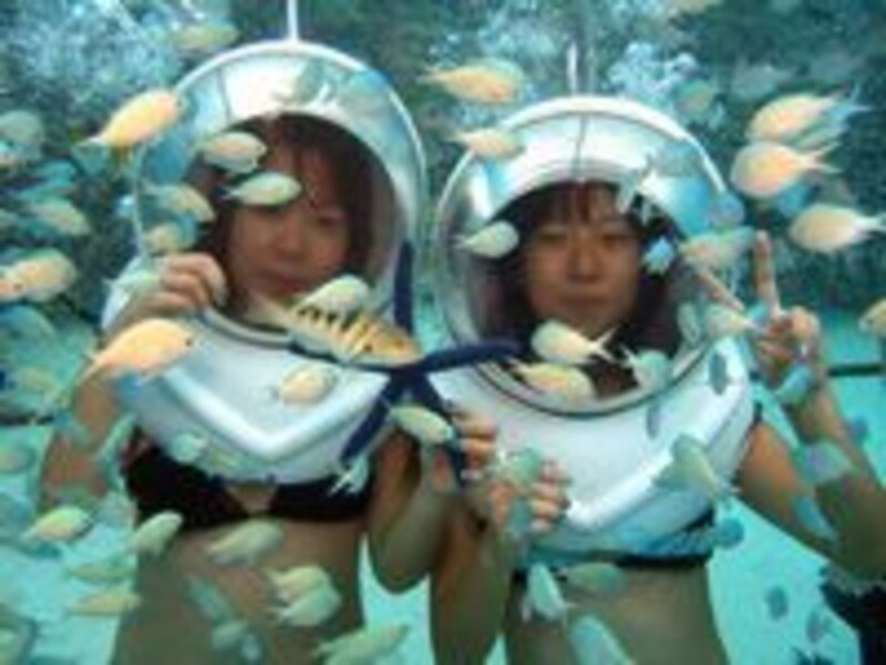 泳げなくても水中散歩ができるシーウォーカー。常に空気が送られてくる特殊なヘルメットをかぶるので、陸上と同じように呼吸ができます。顔が濡れないので、コンタクトや眼鏡を付けたままでも大丈夫。