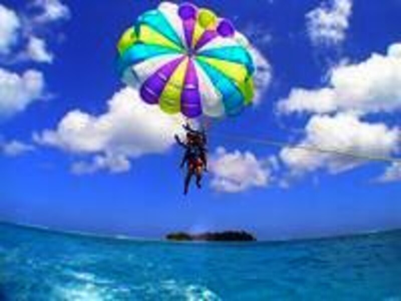パラシュートを背負い、ボートに引っ張られると、あっという間に大空へ! しばし空中散歩が楽しめます。上空30~40mから見晴らす海の色は格別! カップルシートのタイプもあるそうです。