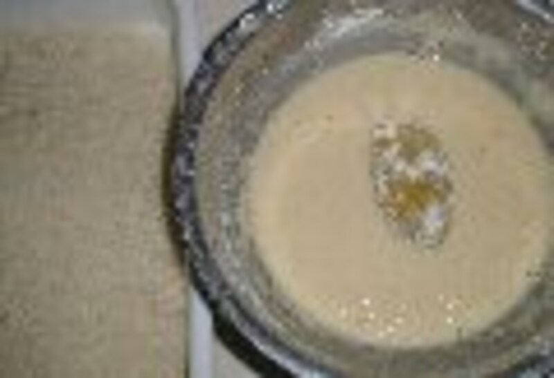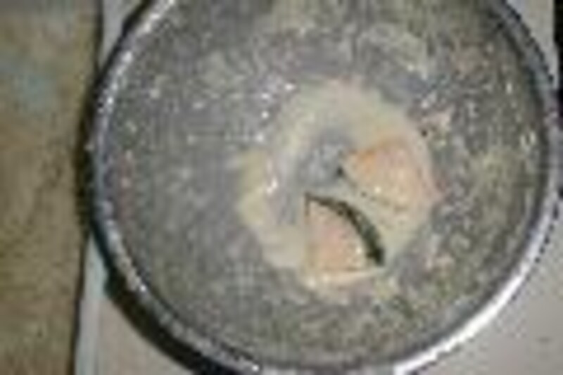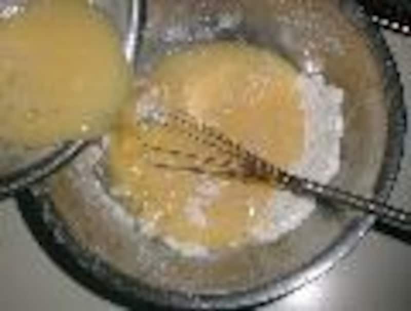 11.卵1個に水を200ccほど加えて混ぜたものを、(10.)のボールに入れ、粉を足し、天ぷらの衣程度の濃さ にする。軽く塩コショウする。