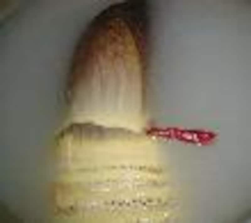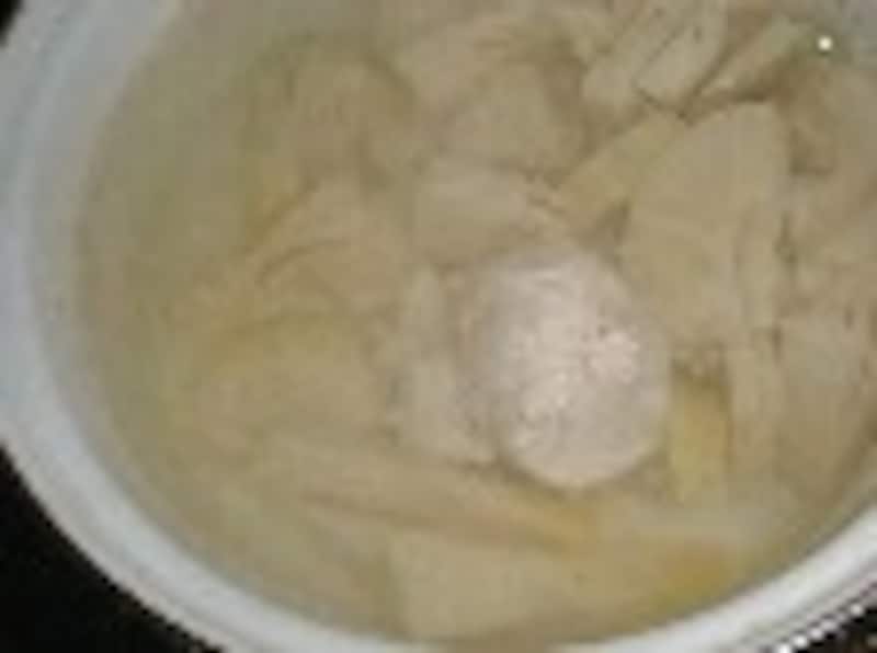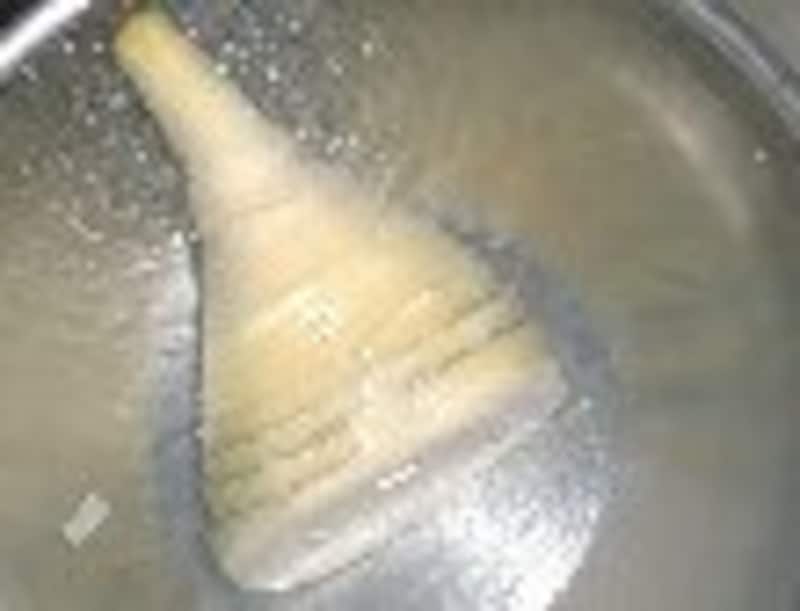 | 孟宗汁(竹の子の粕汁)   孟宗汁 ■材料■ 4~5人前 ・筍........1本 ・だし汁.........7カップ ・酒粕........100g ・味噌..........110g ・若布(岩のり)..........適宜 ■作り方■ 筍の下ごしらえ 1.筍の外の皮を2枚ほど剥いて洗う。 2.底の汚れた部分をけずる。てっぺんを斜めに切り落とし、真ん中に切り目を入れる。  3.鍋に筍と米のとぎ汁(又は水にヌカ1カップ)、赤唐辛子1~2本を入れ、落し蓋をして強火にかける。 4.煮立ったら火を弱め(ぐつぐつ煮えてる状態)、固い部分に串が通るまで、1時間ほど煮る。  5.ザルに上げて、そのまま冷ます。  6.皮を剥いてよく洗い、いぼいぼを落として水にさらす。 7.むいた皮の軟らかい部分を切り取る。(次のページで姫皮ごはんを作ります。) 孟宗汁 1.茹でた筍を好みの厚さに切る。(下の固い部分は繊維に直角に、上の部分は繊維に沿って切る) 2.だし汁(又は水+カツオダシの素)7カップに筍を入れて7~8分煮る。  3.酒粕を加える。溶けたら味噌を加える。 4.塩抜きした若布やアオサを添える。 ひとこと うちでは孟宗汁は筍だけを煮ますが、地域によっては厚揚げや椎茸、豚肉を入れて作る 所もあります。酒と粕の分量もさまざまです。好きな濃さに加減してください。出来たても美味しいですが、温めなおしたのも 味がしみて 大変おいしいです。 |