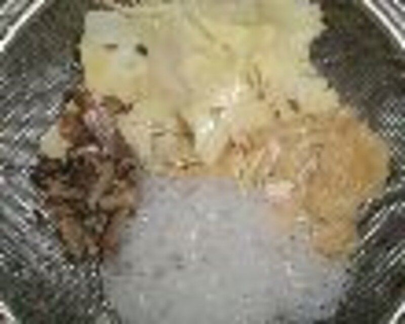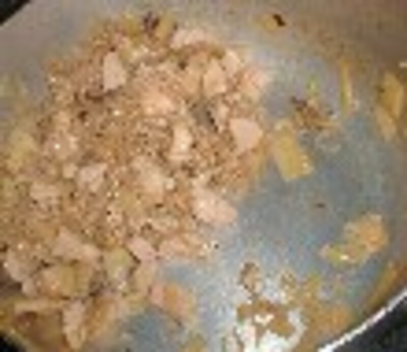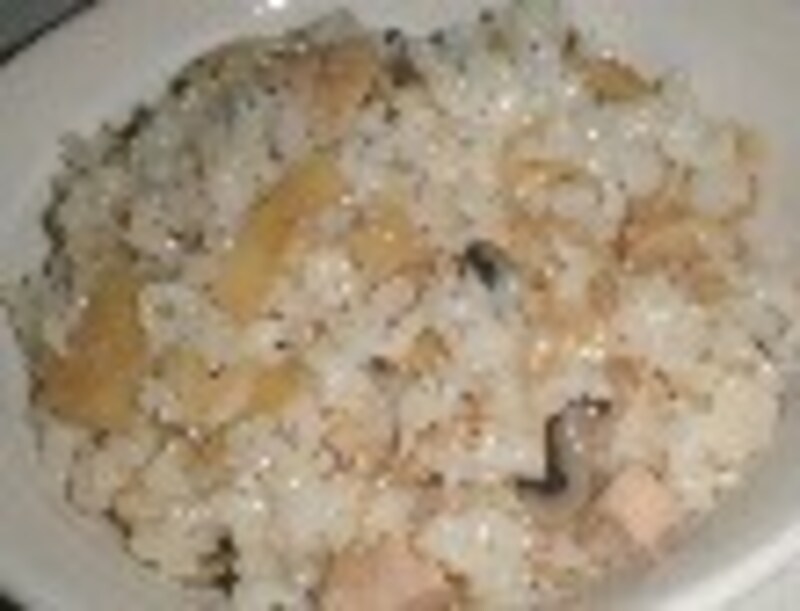 | 筍の姫皮ごはん  ■材料■ ・米........4カップ(4合) ・竹の子の姫皮........1本分 (適当に切る) ・油揚げ........2枚 (熱湯に通し短冊切り) ・鶏肉..........150g (親指の先程度に切る) ・乾し椎茸..........1枚 (もどしてスライス) ・糸コンニャク........80g (サッとゆでて切る) ・だし汁.........300cc ・酒........大さじ3 ・砂糖..........大さじ3~3.5 ・醤油..........大さじ5 ■作り方■  1.米をといでジャーにあける。材料を切る。鍋に入れ ダシ汁(又は水+カツオだしの素)調味料を加え、中火で煮る。  2.目で見て煮汁が半カップ位になったら、汁だけをジャーにあける。水を目盛りまで入れ、塩を小さじ1加えて炊く。  3.具の鍋を火にかけ汁気をとばす。  4.炊けたら具をのせてさっくりかき混ぜる。 |