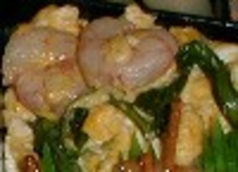 水溶き片栗粉を少量ずついれて味付けし、海老と小松菜を混ぜてフライパンで炒め焼きする。