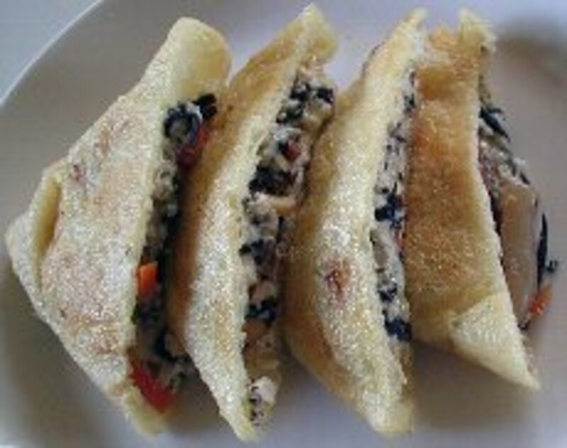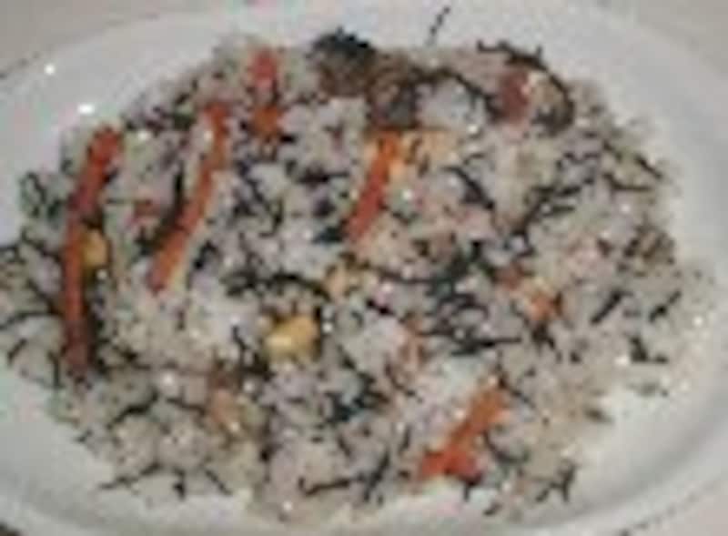 ![]() ■材料■ 2人前 ・ごはん........400g ・卵..........1コ ・サヤインゲン.........2本 ・ひじきの煮物.........適量 ■作り方■ 1.ごはんに酢、砂糖、塩を混ぜて寿司飯を作る。2.ひじきの煮物に醤油と砂糖を少し足し、濃い味に煮つめる。 3.炒り玉子を作る。4.寿司飯とひじきを混ぜ合わせて皿に盛りつける。炒り玉子と塩茹でしたサヤインゲンを散らす。 カリカリ焼き