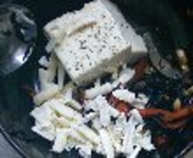 1.ひじきの煮物に、豆腐とピザ用チーズを混ぜる。塩コショウする。