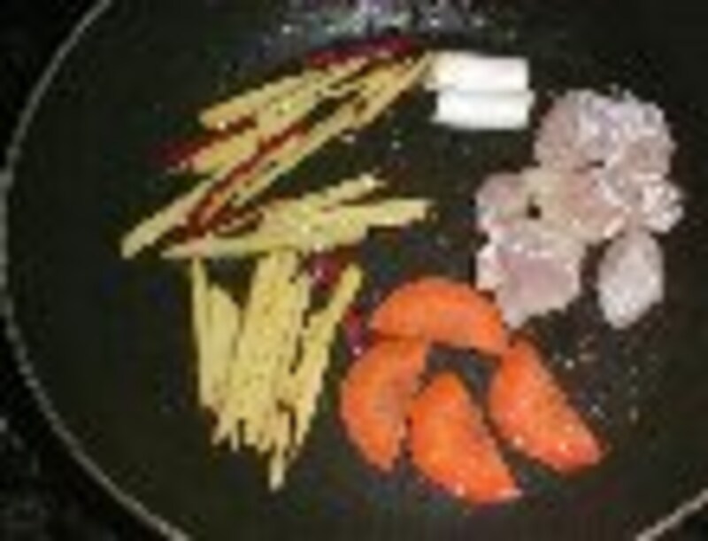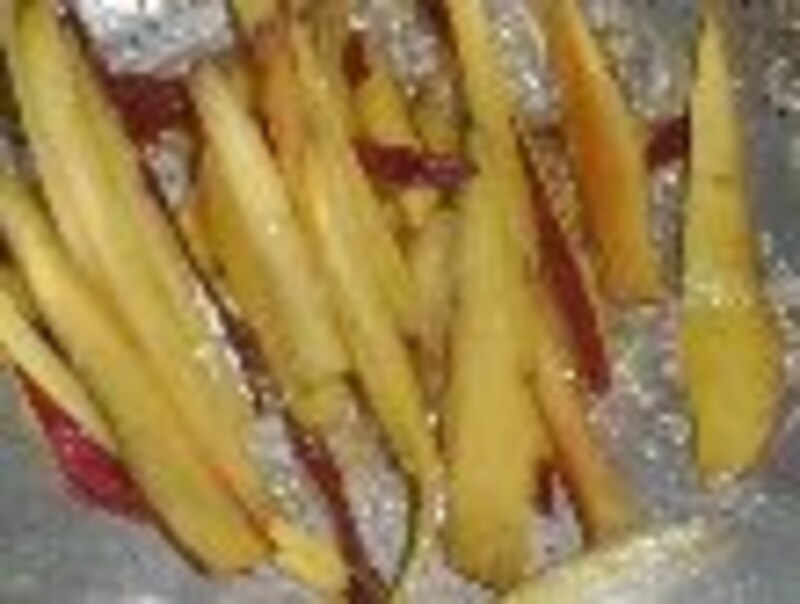細く切って水に通して水気をふいたさつま芋と、薄く半月切りにした人参、長ネギを並べて焼く。