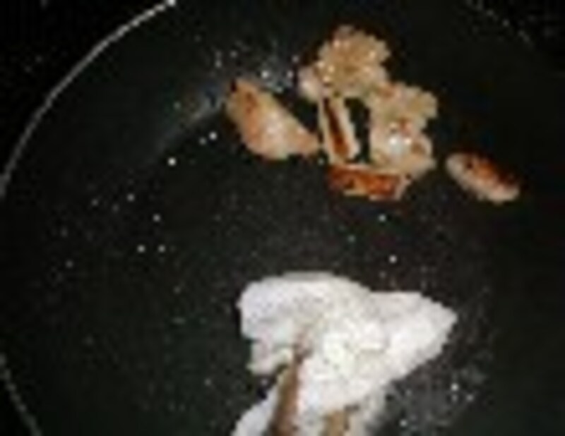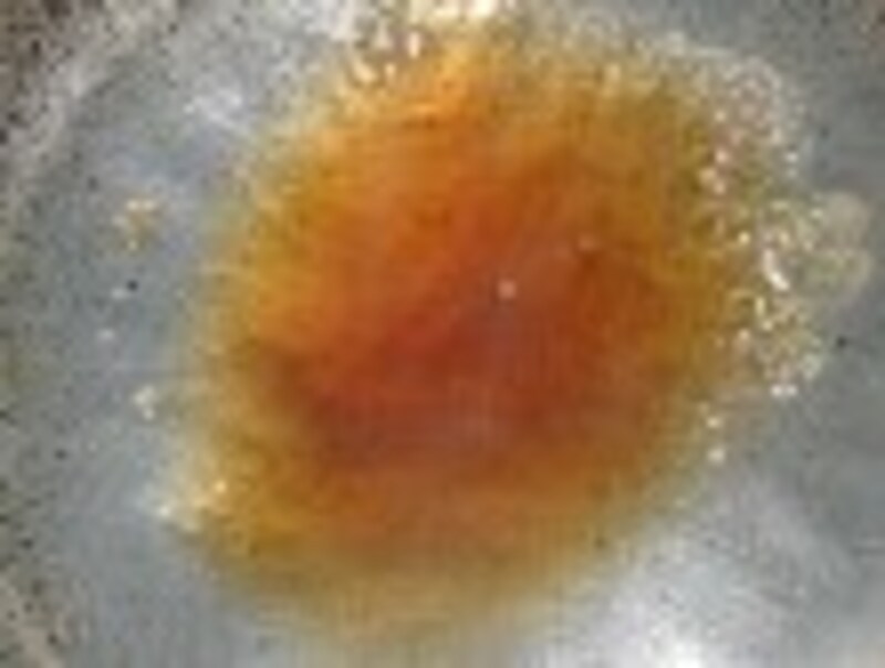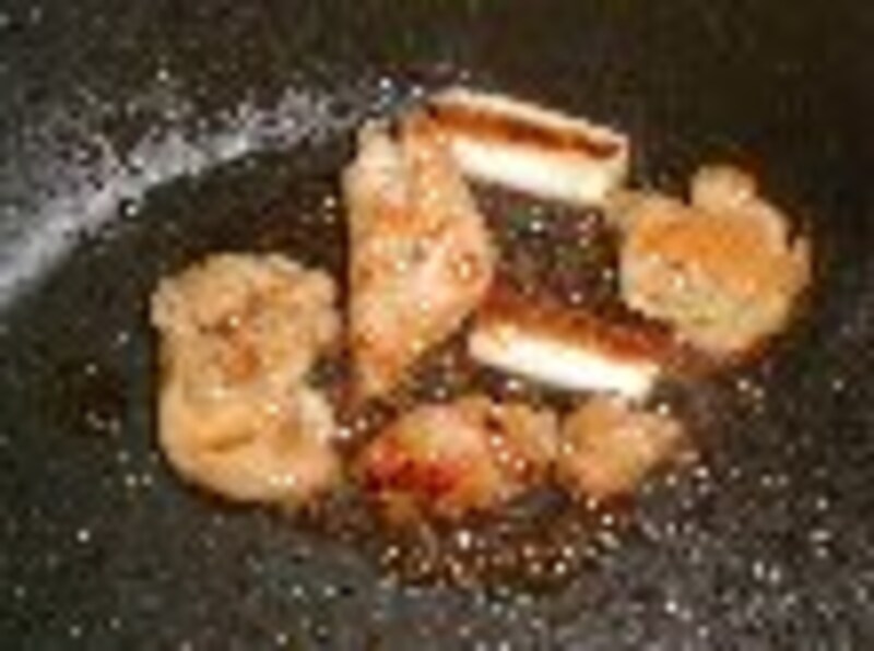 6.フライパンを火から外し、水・ミリン・醤油を同量、砂糖少量を加える。火にかけて煮詰めてからめる。※鶏蒲焼きレシピ
