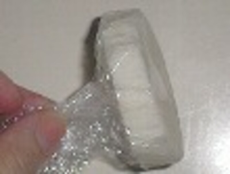 8.ラップに包んだまま、(熱いので)布巾の上から押してつぶして、茶巾に絞る。