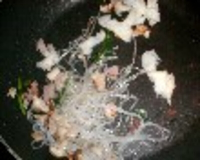 3.フライパンに油を少々を熱し、(1.)の鶏肉を炒め、ベーコン、長ネギ、ゆでホウレン草・もどした春雨、シメジ、ちぎった食パン少々を炒め、軽く塩コショウする。