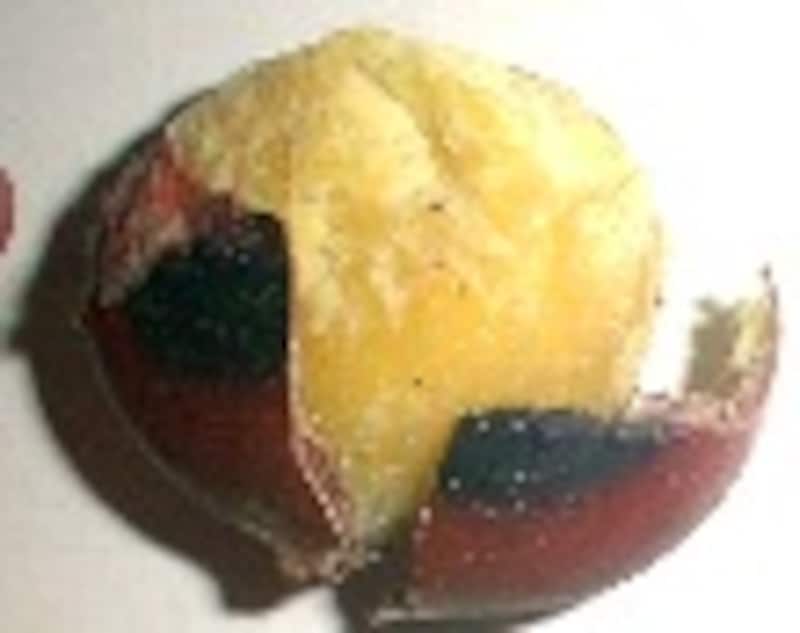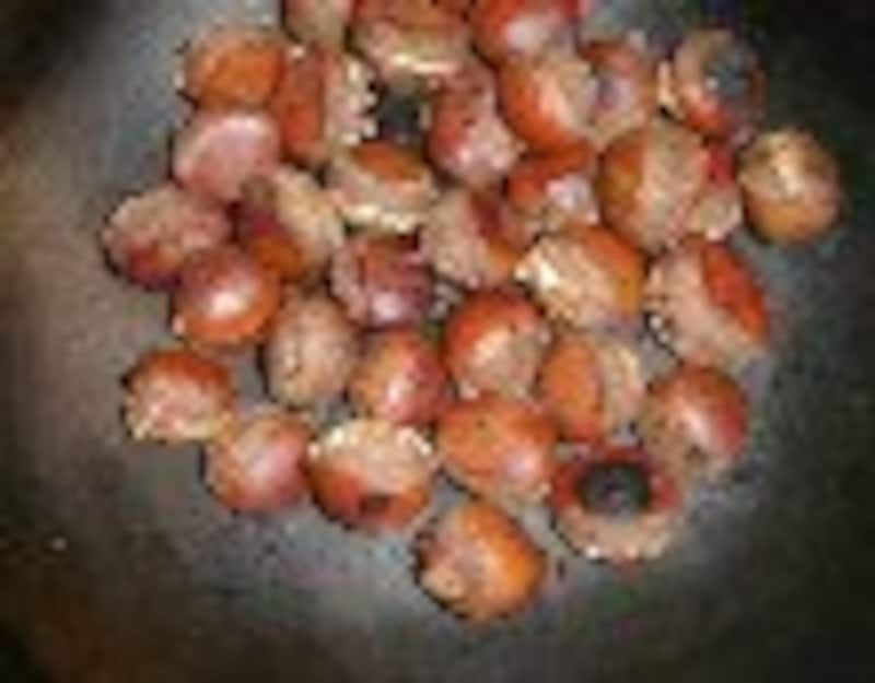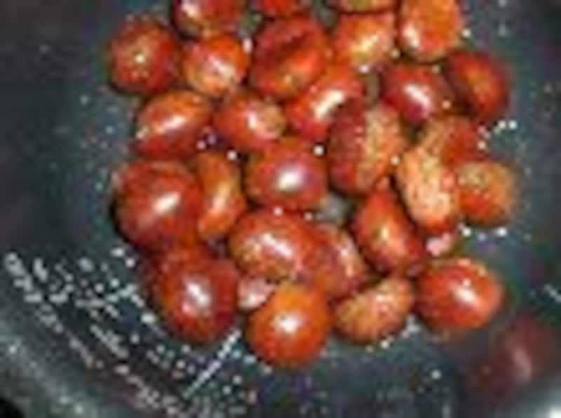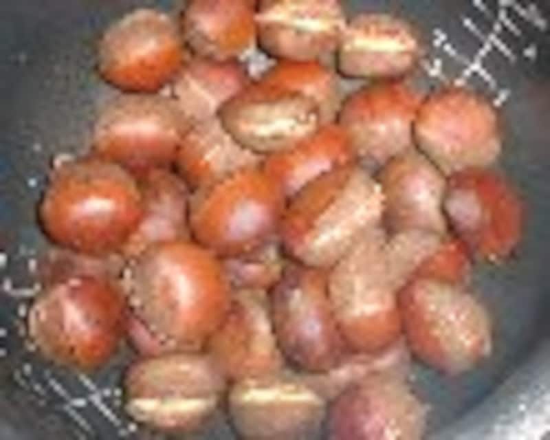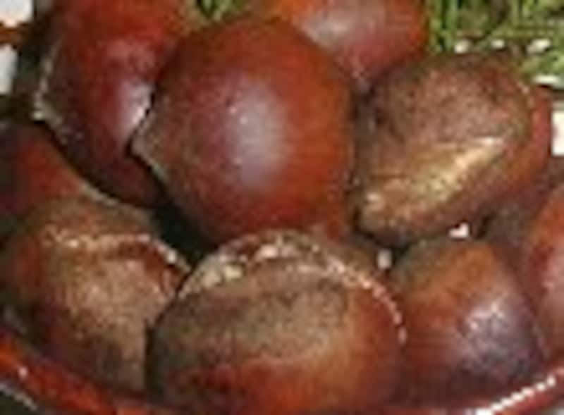ポン栗(笑い栗)は、どうやら、専用の機械にかけて、 お米のポン菓子を作る要領で 作られてるようです。どうにかして、家庭で作れないものかと思い、とりあえず炊飯器で炊いてみました。 市販のポン栗のように『皮がクルンと剥ける』、てな具合にはいきませんが、大変おいしい蒸し栗になりました。 フライパンで焼き目をつければ、見た目はまるで本物のポン栗。 使用する電気炊飯器は普通のものでも大丈夫でしたが、 圧力IHジャー炊飯器のほうが、より ふっくらホクホクに仕上がるようです。 ※炊飯器で簡単クッキング&注意書き 焼き栗 ■材料■ ・栗..........400g ・水.......120cc ■作り方■ 1.栗を洗い、底に包丁で切り込みを入れる。(皮が硬く、 危険なので十分注意すること!) 2.炊飯ジャーに入れて、水を120cc注ぎいれ、普通に炊く。 (圧力IHジャー炊飯器使用の場合は発芽玄米・胚芽米炊きにあわせる。) 3.スイッチが切れたら取り出す。これで完成にしてもよい。 4.フライパンに入れ(油は不用)、蓋をして、強火で煎って焼き目をつける。 5.焼くと皮がぱりぱりになるので多少剥き易くなる。 (市販のポン栗みたいにスルリと剥けるわけではないが、普通の茹で栗や蒸し栗よりはずっと剥きやすい。) 6.焼かなくても十分おいしい。 次のページは、炊飯器でふかし芋 □ 昨日紹介したのは「煮豆」 レシピはこちら! 12次のページへ