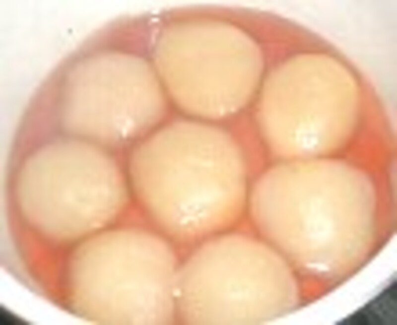 3.煮立ったら、火を弱めて、竹串がスーッと通るくらいまで、30分間ほど煮る。火を止めて、ラフランスを取り出す。