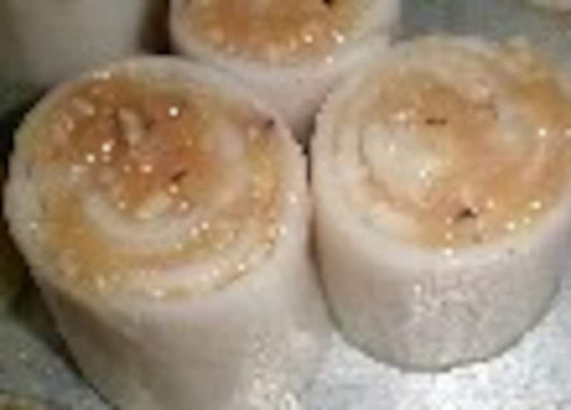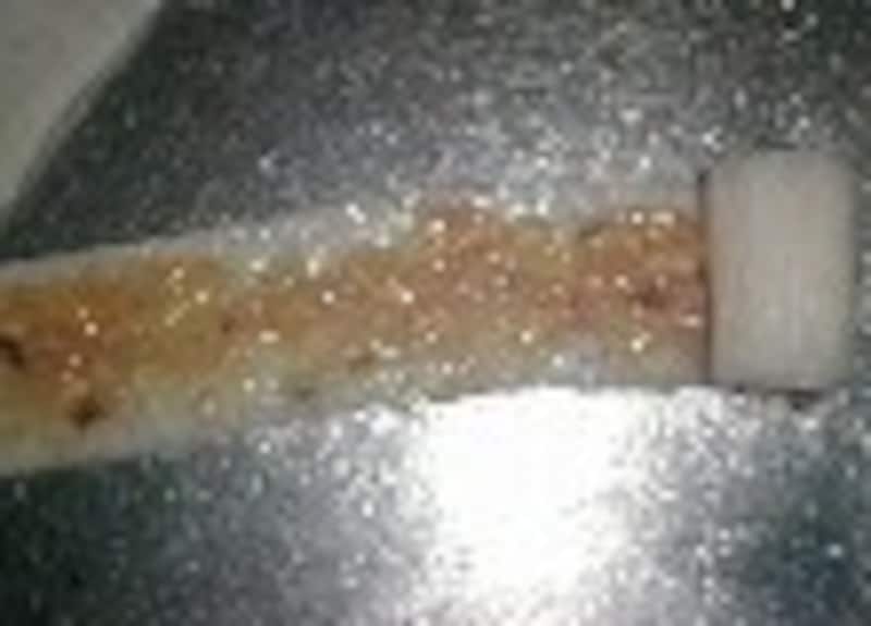 片栗粉を茶漉しでパラパラふりかける。挽肉ミンチを塗り、巻き込んでいく。太い大根は一個で二つ作り、細いものは一個で一つ作る。