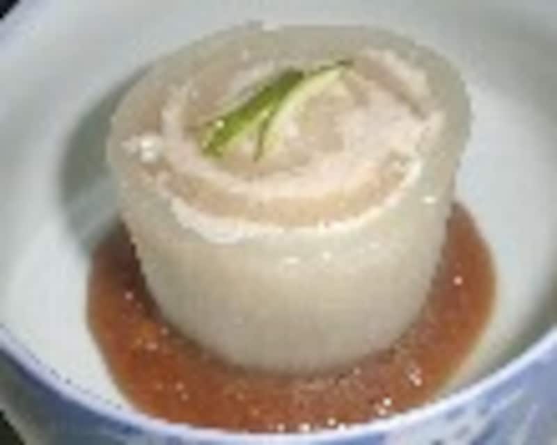 8.大根の上にあんをかけて、柚子やカボスの皮をかざる。