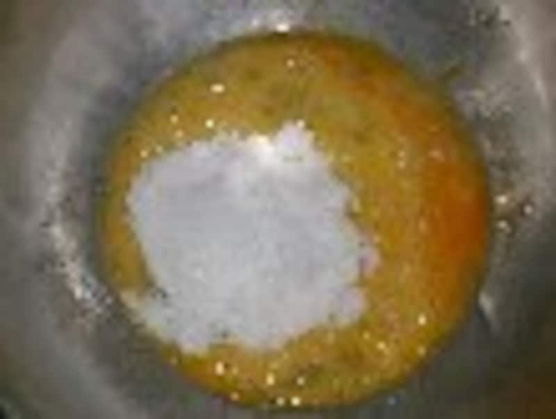 3.ボールに卵をいれて軽くまぜ、砂糖を加える。別のボールに風呂の温度位の湯を入れて、その上に卵のボールを重ねて泡立てる。
