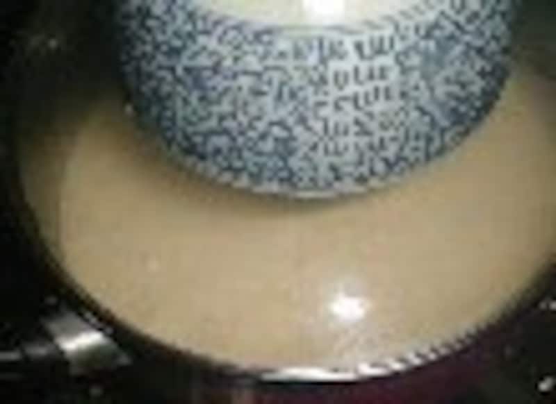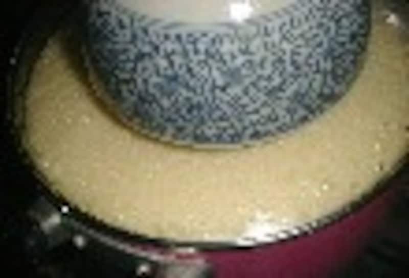 6.鍋に流し入れる。ぴったりの蓋をする。丼をかぶせて重しをし、蓋が動かないようにする。
