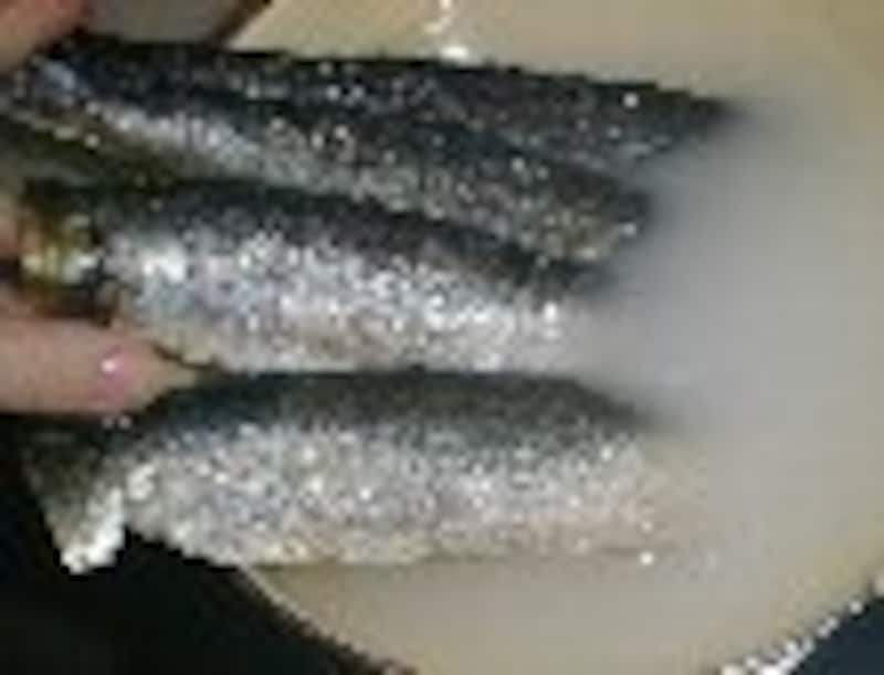 2.水でよく洗ってウロコを取り、水気を拭きとって、頭と尾を切り落とし、4つに切る。