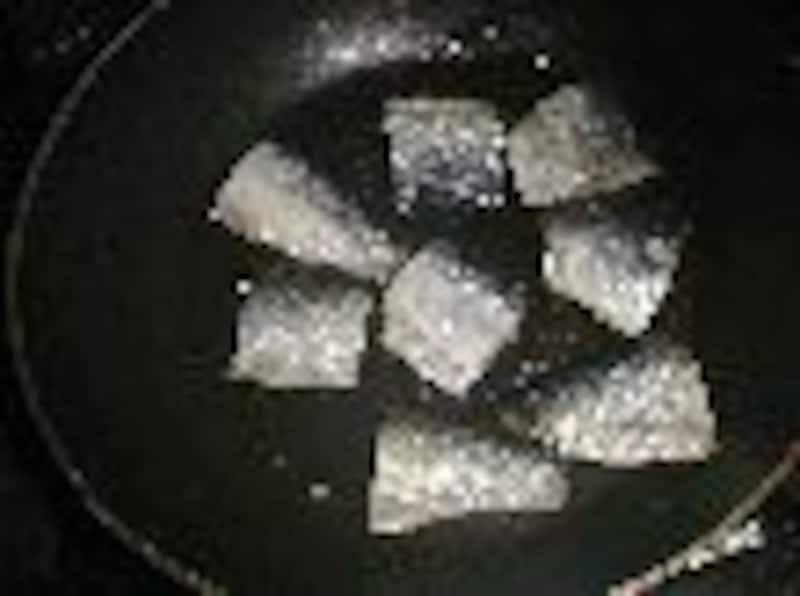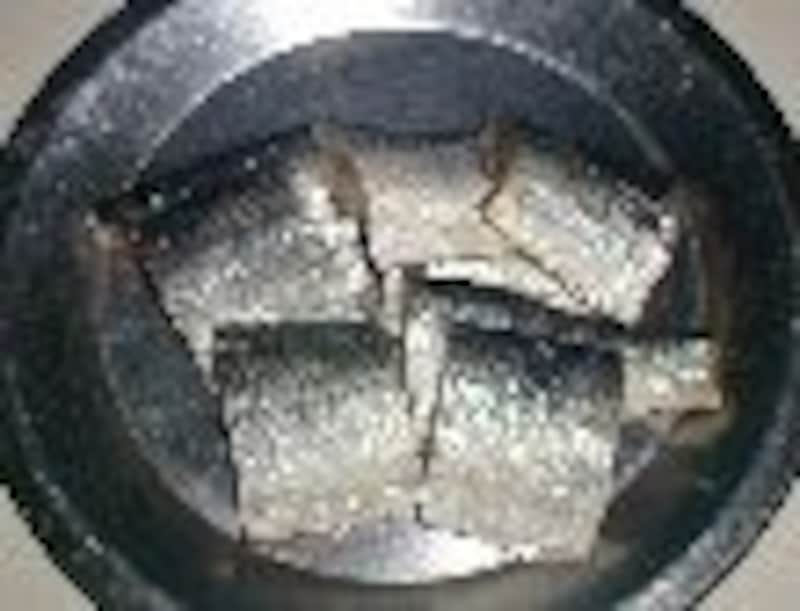 4.フライパンにサラダ油を少々熱し、身欠きにしんの皮を上にして並べて焼く。