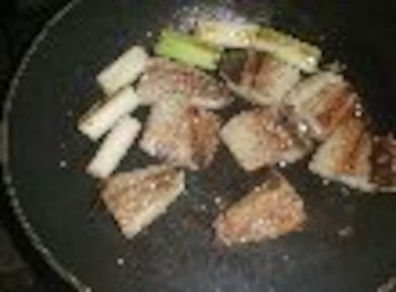 5.裏返し焼く。長ネギのぶつ切りを焼く。