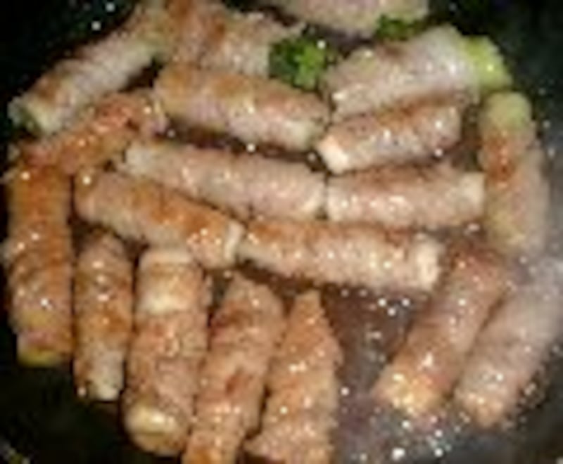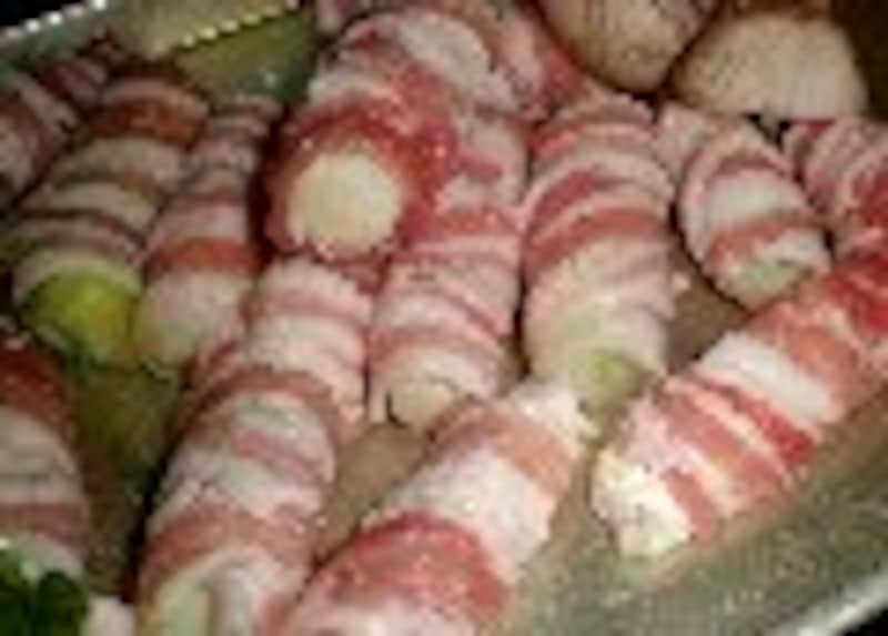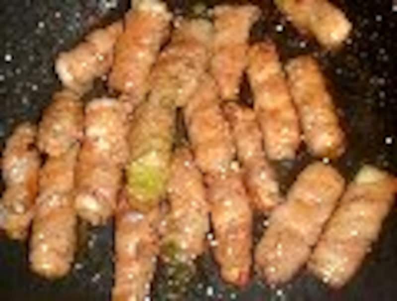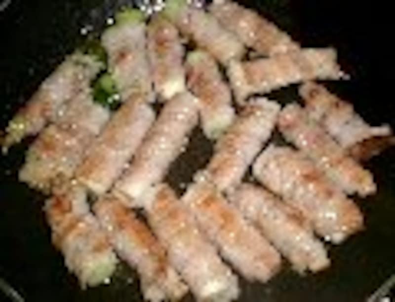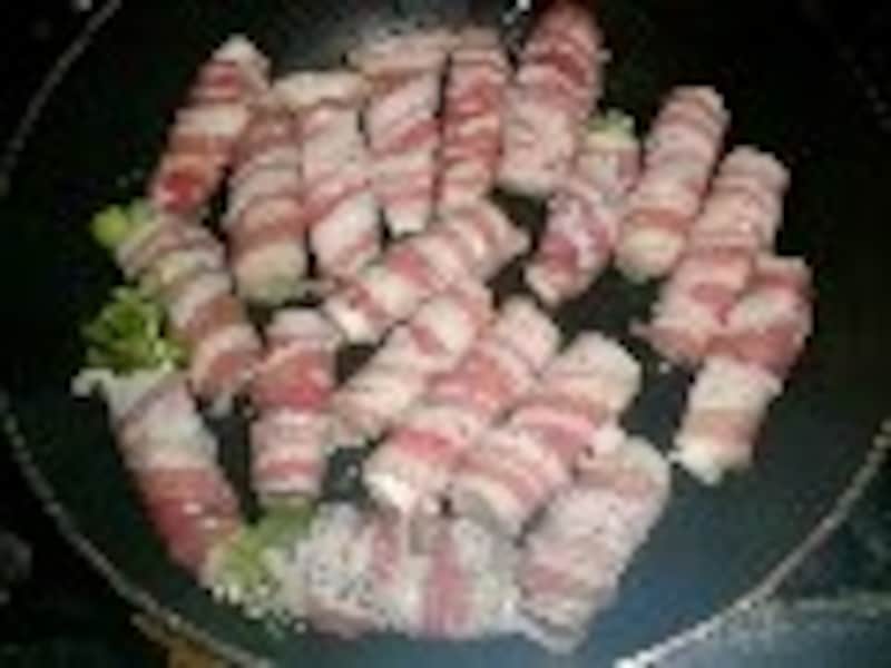 3.フライパンを熱し、少量のサラダ油をしいて、肉巻きを並べる。