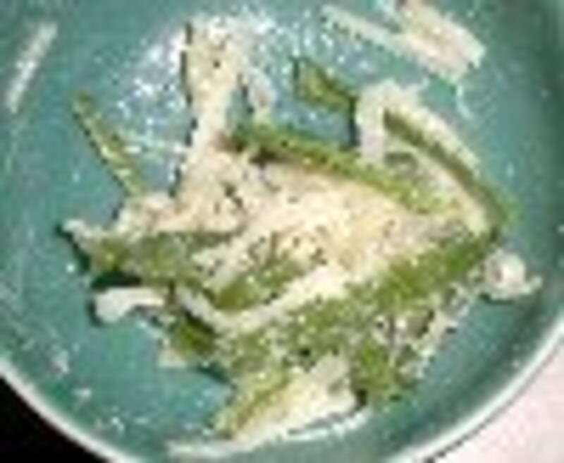 胡麻豆腐の添付されていたみそだれを、焼き茄子にからめて、糸カツオをのせる。