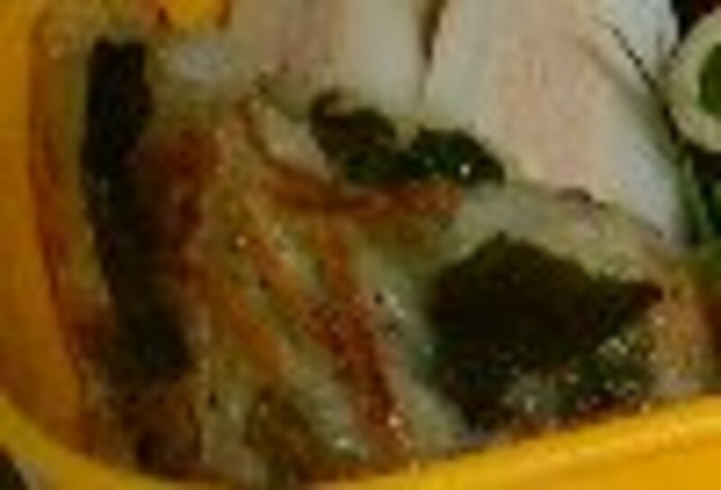 ・ いろどり茹で卵 ・ 小松菜の三色巻き ・ じゃが芋のお焼き ・ 茄子のみそ焼き ・ ゆり根の梅肉和え ・ 人参チェック ・ 焼き鳥、焼きネギ ・ ツナマヨ蒲鉾(市販品) |