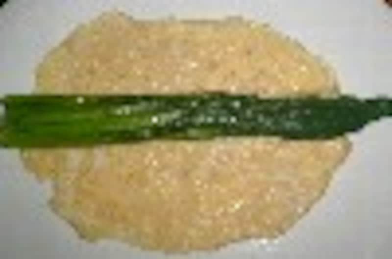 その上を半分に切った板海苔で巻く。巻き目を下にしておちつかせる。
