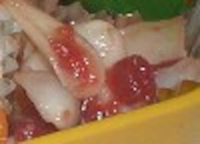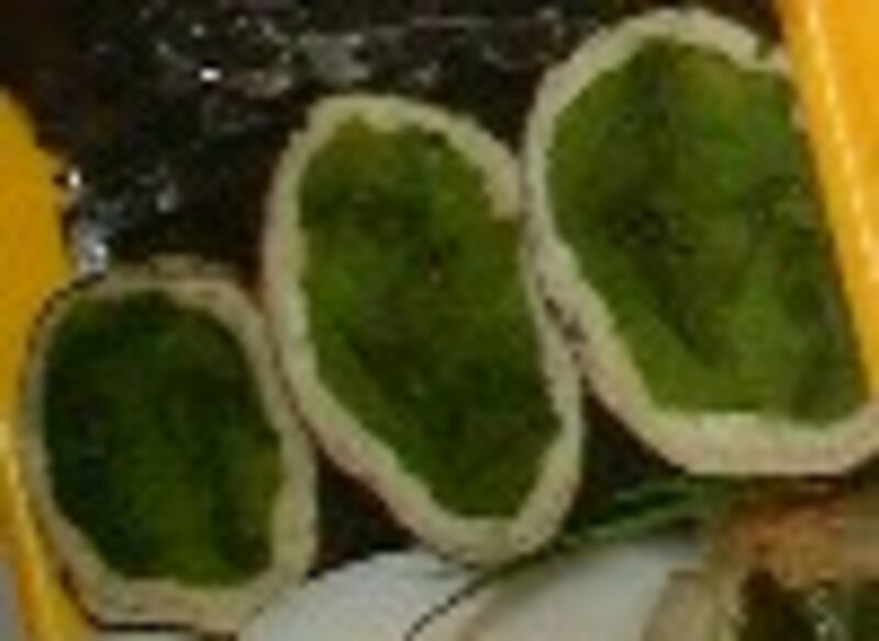 卵半個を、塩と酒で薄く味付けし、薄焼き玉子を焼き、手でギュッと握って汁気を絞った小松菜をのせて巻く。※薄焼き玉子の焼き方