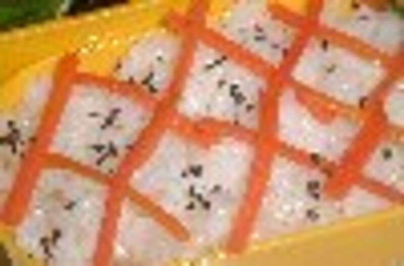 水・ミリン・醤油、各少量ずつを鍋にとり、細く切った人参を入れて炒り煮したものを、ご飯の上にチェック柄にのせ、黒ゴマをふる。