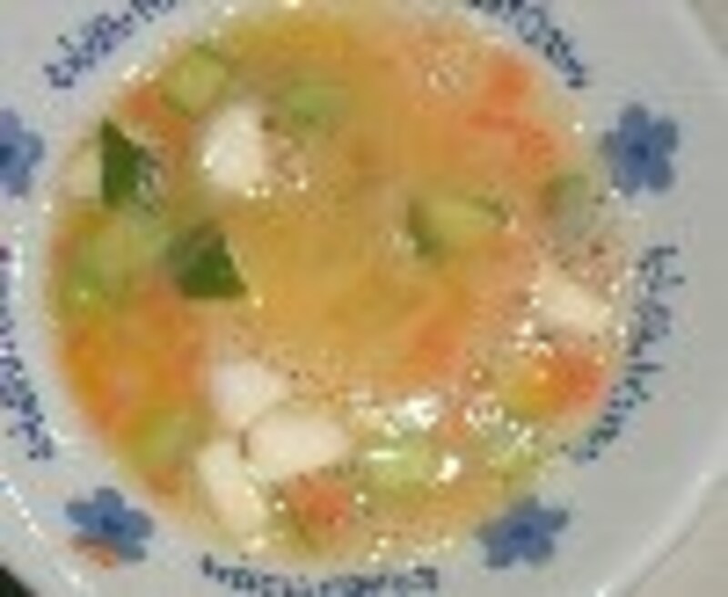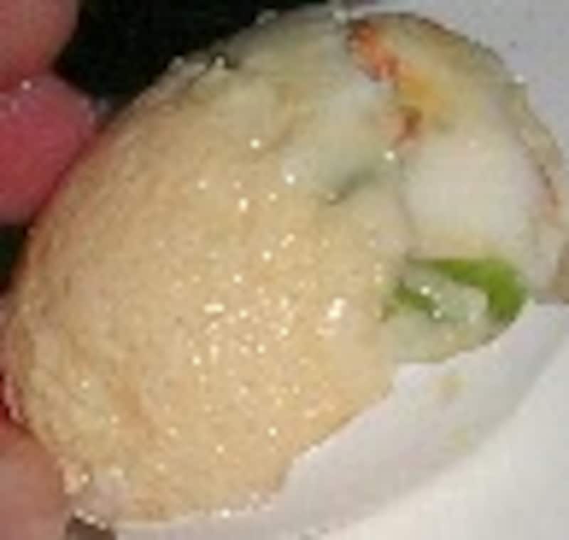 卵の先を包丁で突いて穴をあけ、中身を振り出す。卵1/2にミリン、水、カツオだし顆粒一つまみで調味し、小さく切ったハンペン、人参、小松菜を混ぜて、卵の殻の八分目程度に流し入れる。