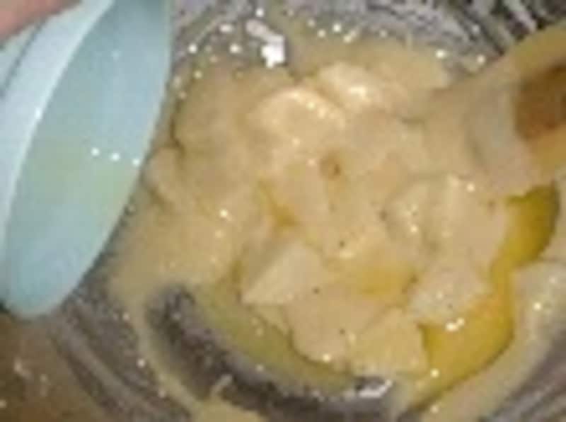 前々ページと前ページで紹介した ケーキレシピは、どちらも 3~5分間程度の追い炊きが 必要でした。このページでは、3合炊き炊飯器で、確実に一度炊きで焼きあがるレシピを 紹介したいと思います。二人で食べてちょうどいい位の、小さいアップルケーキです。 使用した道具:東芝三合炊き炊飯器・キッチンスケール・ボール・泡だて器・ゴムベラ ■炊飯器で楽々クッキング&注意点 アップルケーキ ■材料■ 1~2人分 ・りんご ........................1/2コ ・レモン汁 ......................少々 ・薄力粉 ........................65g ・ベーキングパウダー ............小さじ2/3 ・砂糖 ..........................50g ・塩 ............................二本指で一つまみ ・卵 ............................1/2コ ・牛乳 ..........................45~50cc(卵とあわせて70cc) ・バター ........................20g ■作り方■ 1.内釜にバターかサラダ油をぬる。りんごの皮を剥いて3つに割り、厚さ5ミリに切り、レモン汁をまぶしておく。 2.小麦粉とベーキングパウダーをボールにとり、泡だて器でかき混ぜる。次に砂糖と塩を加えてかき混ぜる。 耐熱容器にバターを入れて10秒ほど電子レンジにかけて溶かす。(又は湯せんで溶かす。) 3.粉に卵と牛乳を混ぜた液を流しいれ、泡だて器でかきまぜる。 りんごを加えてゴムベラで混ぜ、手で容器をさわって温かく感じる温度(45℃)の 溶かしバターを加えて混ぜる。 4.生地を釜に流し入れ、真ん中をくぼませ加減にして炊く。 5.スイッチが切れたら、取り出して網の上で冷ます。 ※チョコバナナケーキのページへ! このレシピへの質問は上記のガイド問い合わせまで。 【編集部おすすめの購入サイト】Amazonで人気レシピの書籍をチェック!楽天市場で人気レシピの書籍をチェック!前のページへ123※記事内容は執筆時点のものです。最新の内容をご確認ください。※衛生面および保存状態に起因して食中毒や体調不良を引き起こす場合があります。必ず清潔な状態で、正しい方法で行い、なるべく早めにお召し上がりください。また、持ち運びの際は保存方法に注意してください。