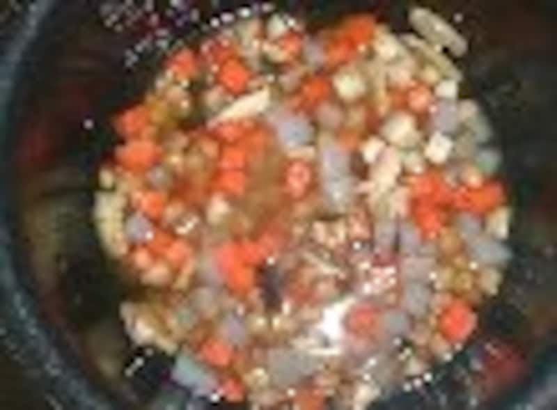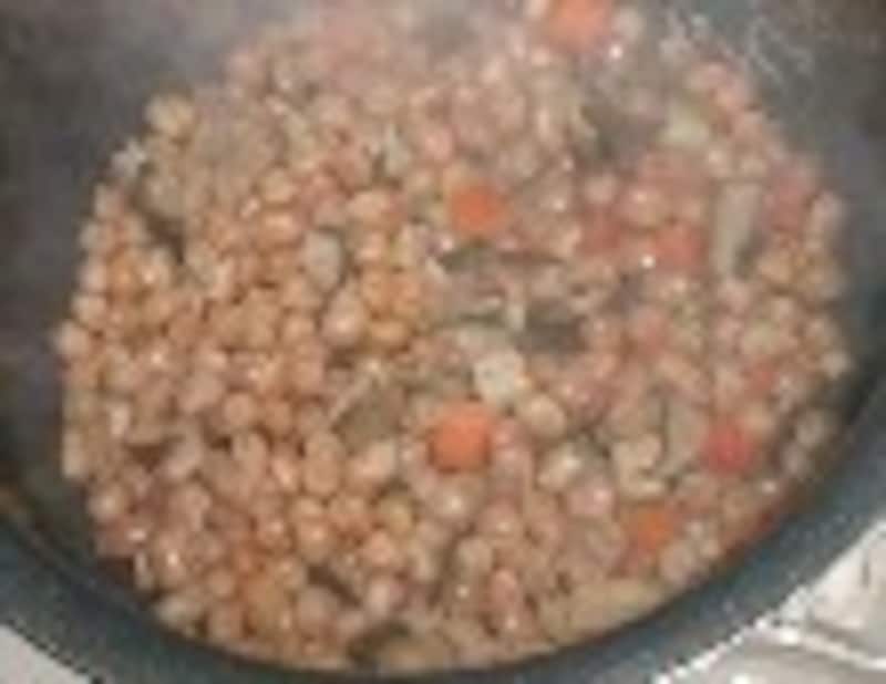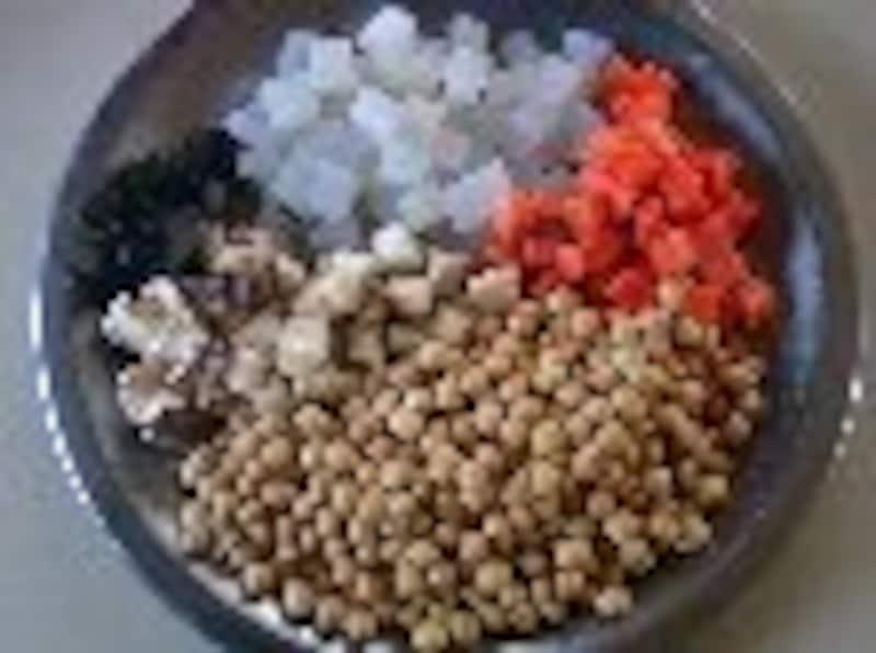 乾燥大豆を水にひたさずに 炊飯器で炊きます。豆がとろけるように柔らか、というわけにはいきませんが、 少し噛み応えのある豆は、どこか懐かしく、ふくよかで香ばしい豆本来の味がします。身体の健康に良い素材だけを煮込みました。箸で一粒ずつつまんで口に運んで、ゆっくり噛みしめたい一品です。 (使用した炊飯器は五合炊きです。) ■炊飯器料理一覧と注意点 お釜で五目豆 ■材料■ 4人分 ・乾燥大豆 ..............................米の計量カップで1杯 ・スライス乾し椎茸 ......................15枚位 ・ごぼう ................................50g ・人参 ..................................60g ・こんにゃく ............................1/3枚(90g) ・出し昆布 ..............................5×8cm ・水 ....................................米の計量カップで1杯と2/3(270cc) ・醤油 ..................................大さじ1.5 ・酒 ....................................大さじ2 ・砂糖 ..................................大さじ1.5 ・塩 ....................................一つまみ ・サバ節の粉(又は鰹だし顆粒) ..........少量(小さじ1/4程度) ・ミリン ................................大さじ1 ■作り方■ 1.大豆をフライパンに入れて、弱めの中火で炒る。皮がはじけて、指でつぶせるまでになったら火を止める。 2.牛蒡の皮をこそげて大豆の大きさの角切りにし、水にさらす。人参も同じ形に切る。コンニャクも同じ大きさの角切りにして熱湯でサッとゆがく。 昆布はハサミで四角に切る。(実際に使った昆布は、出汁をとった後の出汁昆布を乾しておいたもの。) 3.内釜に材料を全部入れ、米の計量カップで水を1杯入れ、同じカップに酒と醤油を入れて水を足して1杯にして入れる。 砂糖、塩、サバ節の粉(又は出汁の素)を入れてかき混ぜて、普通に炊く。 4.スイッチが切れたら、ミリンを大さじ1杯回し入れて蓋をして保温スイッチを切り、2~3分間蒸らす。ヘラでかき混ぜて器に盛る。 ひと言 炊き上がってから加えるミリンは、ツヤとしっとり感を出すためで、釜が熱いうちに入れます。 出汁をとった後の出し昆布を、乾かしておけば、今日のような煮物に使えて便利です。 ※半日水にひたしておいた大豆を使って作った五目豆は次のページで! このレシピへの質問は上記のガイド問い合わせまで。 ■ 昨日紹介したのは「環境と体に優しい切り干し大根の煮物」 レシピはこちら! 12次のページへ