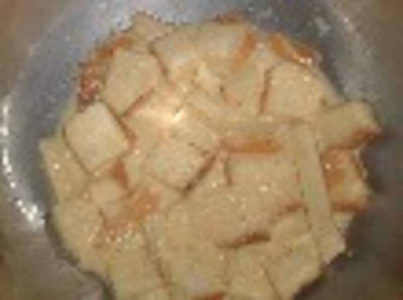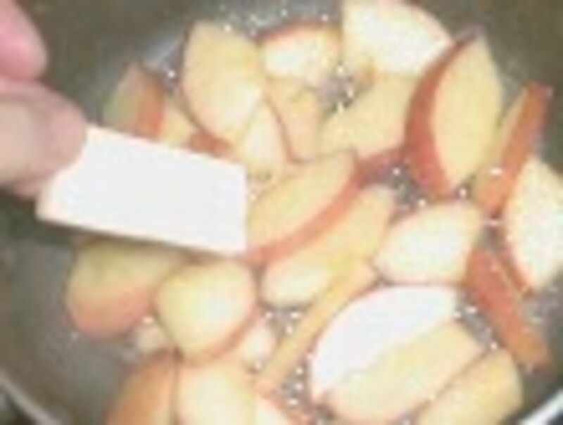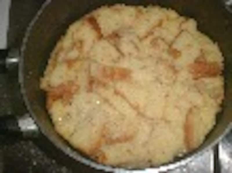 ふんわり柔らかでジューシーなパンプディングの上に、甘酸っぱい焼き林檎を重ねました。が、作り方は逆で、鍋かフライパンで焼き林檎を作って、その上にカスタード液に浸したパンをのせて蒸し焼きにします。タルトタタンのプディングバージョンといった感じでしょうか。 ■鍋で焼くスポンジケーキ アップルブレッドプディング ■材料■ 20cmの鍋用 ・卵 ....................................L3個 ・牛乳 ..................................300cc ・パン ..................................150g(厚切り食パン2枚と耳少々) ・りんご ................................1個 ・レモンスライス ........................4枚 ・バター ................................20g ・砂糖 ..................................大さじ7 ・ブランデー ............................少々 ■作り方■ 1.リンゴを洗い、四つに切ってヘタを取って5~7ミリにスライスし、スライスレモンを半分に切り、鍋に入れ、砂糖を大さじ3をまぶしてしばらく置き、中火にかける。 2.リンゴがしんなりしたら、バターを加えて煮からめる。 3.卵、牛乳、砂糖大さじ4、ブランデー少々を混ぜ合わせてカスタード液を作り、角切りにしたパンをひたして染み込ませる。 4.(2.)のリンゴの上にパンを流し入れて、ぴっちり蓋をして、弱火で20~25分間焼き、中までしっかり火を通しカスタード液を固める。手で押してみて弾力があれば大丈夫。 5.火を止めてしばらくすると、鍋とプディングの間に隙間が出来るので、そこで皿の上に逆さに取り出す。 ※炊飯器レシピは次のページで! ■ 前回紹介したのは「ギョーザドッグ」 レシピはこちら! 12次のページへ