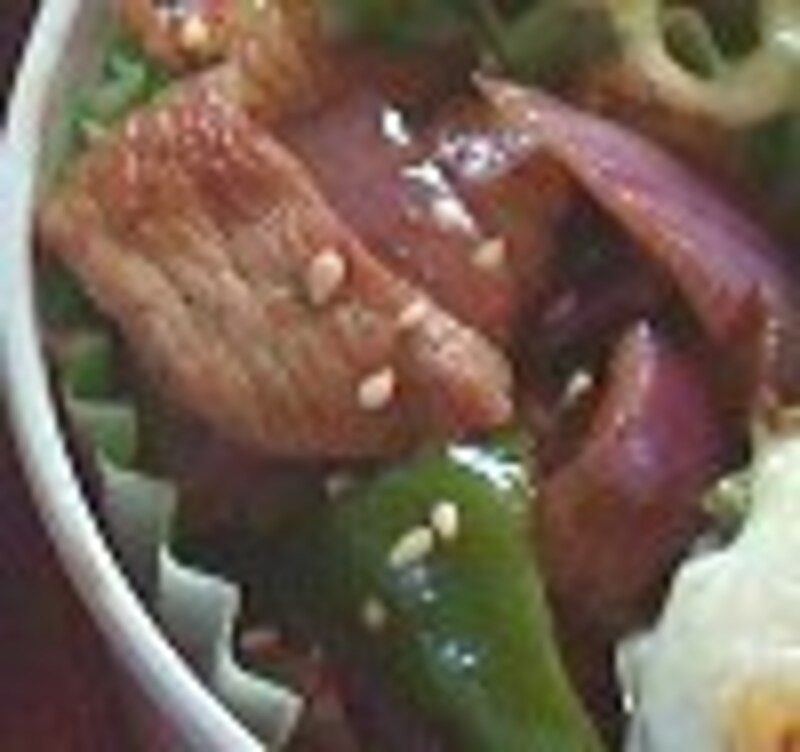 薄切り肉を炒め、ざく切りしたキャベツ、ピーマン、玉ねぎを加えて炒め、、塩こしょうして焼肉のタレを加えて炒め合わせる。白ゴマをふる。