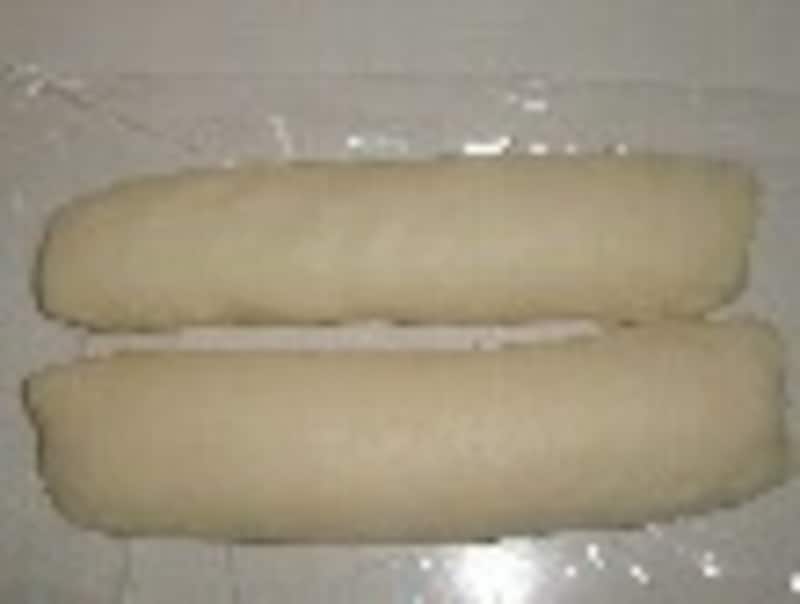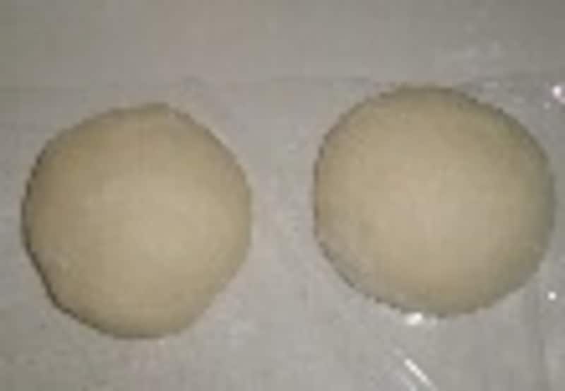 4.打ち粉(強力粉)をした台に取り出して、2つにカットして切り口を閉じるようにして内側に押し込めて丸める。固く絞った濡れ布巾をかけて10分間休ませる。