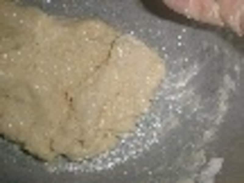 を混ぜて、粉に流し入れて手でこね、まとまってきたらバターを練りこみ、しっかりこねる。