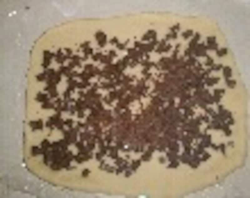 5.麺棒で長方形に伸ばし、チョコをのせて海苔巻きの要領で巻いていき、巻き終わりを指でつまんで閉じる。