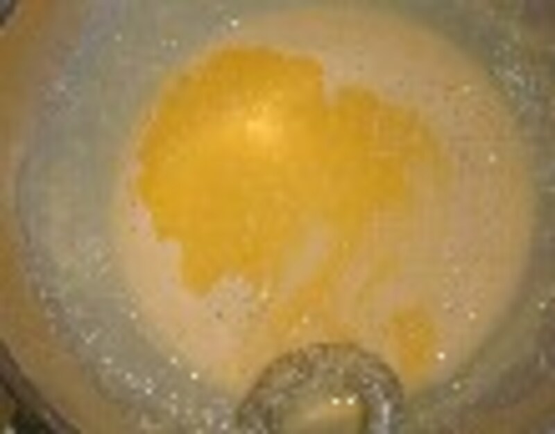 (1.)の粉類を加えてしっかり混ぜ、溶かしバターを加えて泡だて器でかきまぜる。