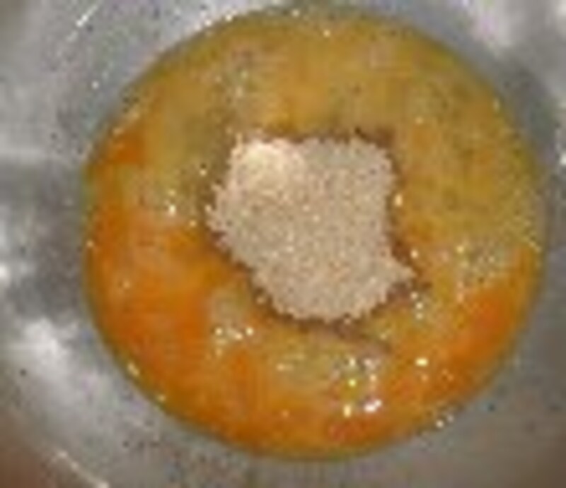3.湯煎用のボールに、40℃位の湯(お風呂の温度)を入れる。一回り大きいボールに卵を入れて軽くほぐして砂糖を加え、湯煎にあてながら、ハンドミキサーの高速で泡立てる。