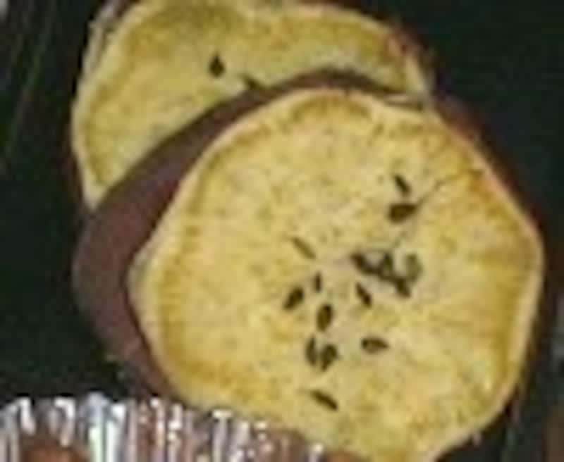薩摩芋を電子レンジで加熱して輪切りにし、ごま塩をかける。