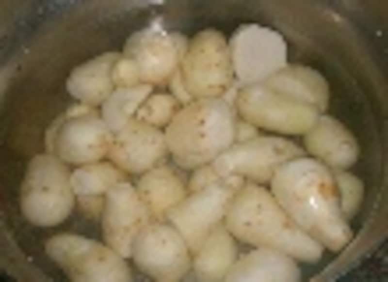 1. 泥つき里芋を、たわしでこすって洗い、ザルにあげて乾かしておく。里芋の皮をこそげて洗い、 大きさが揃うよう、大きい芋を切る。