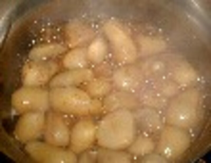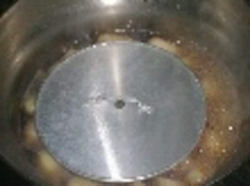 4. (この時点で芋が柔らかくなり、煮汁が少なくなってる)蓋を外し、 火を強めて 数分間煮ころがして つやを出し 火を止める。