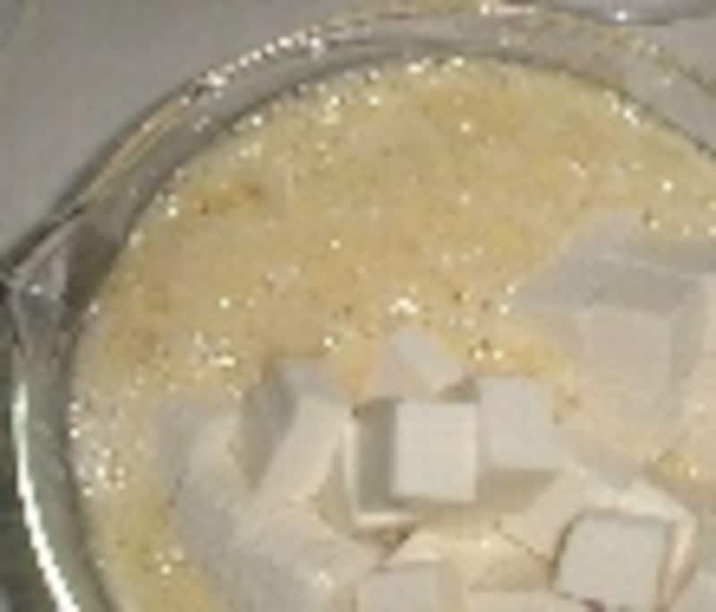 豆腐を1cm角に切り、(一人分あたり5個)長芋に混ぜ込む。