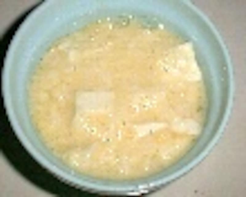 耐熱容器に流しいれて、オーブントースターに入れて焼く。(急ぐ時は電子レンジで加熱しても良い)